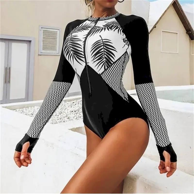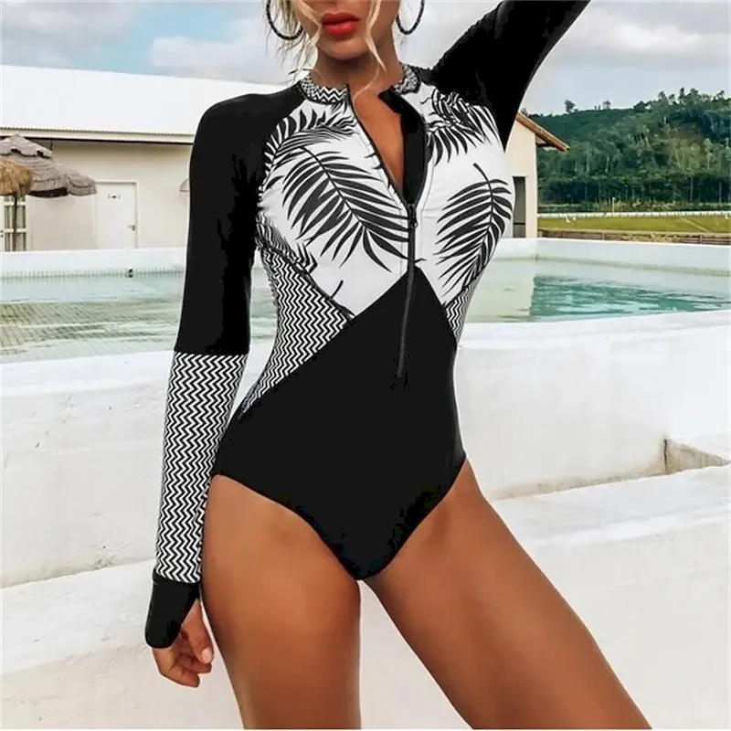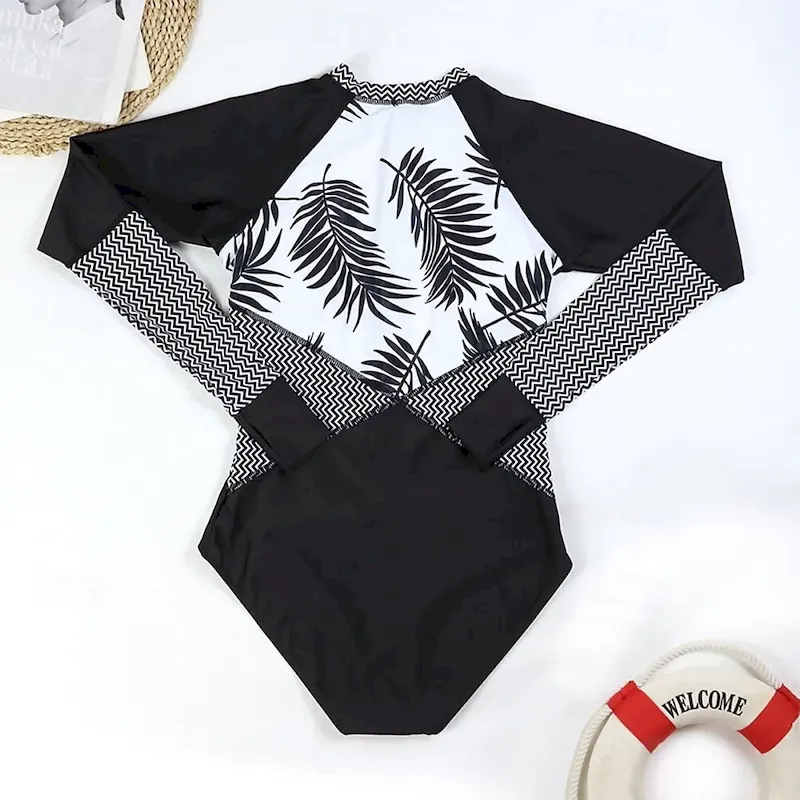Women’s Rash Guard One Piece Swimsuit Floral Tropical UV Sun Protection UPF50+ Quick Dry Spandex Long Sleeve Bathing Suit Front Zip Surfing Beach Water Sports Summer