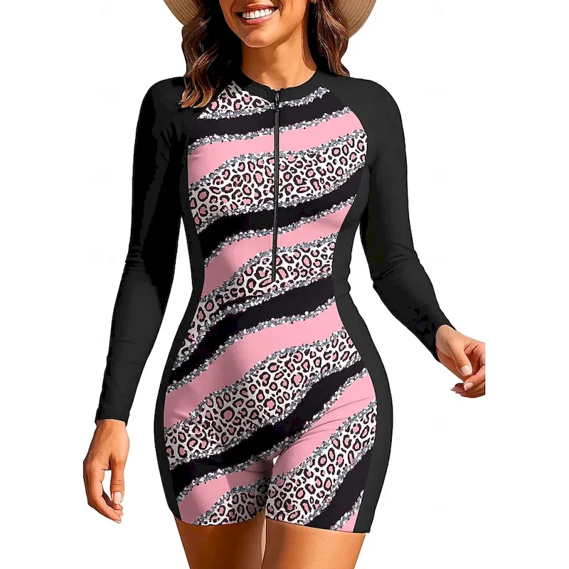 Women’s Regular Rash Guard One Piece Surfing Suit Bathing Suit Leopard Stripes Abstract UV Sun Protection UPF50+ Ultra Light (UL) Long Sleeve Zip Up with Built in Bra Removable Pad Surfing Canoeing
