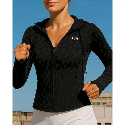 Selling Points 1.Gender: Women’s2.Elasticity: Micro-elastic3.Function: Lightweight Sun Protection4.Sleeve Length: Long Sleeve5.Design: Full Zip6.Pattern: Graphic Specifications Gender:Women’sSports Clothing Sub Category:Running Top,Running